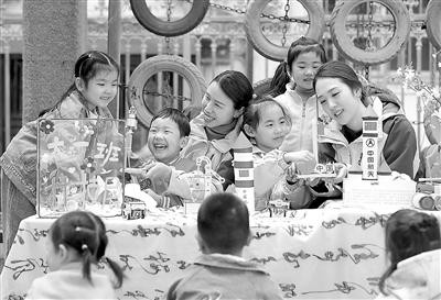 在湖北省荆门市电力幼儿园举办的“触摸未来”科技节上,老师引导孩子们对组装的空气动力火箭进行测试发射。 赵平 摄